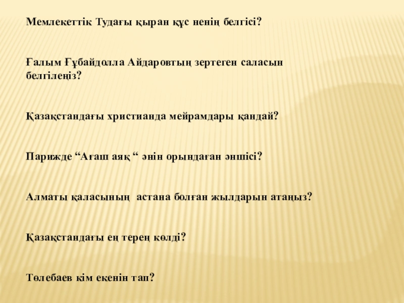Мемлекеттік Тудағы қыран құс ненің белгісі?Ғалым Ғұбайдолла Айдаровтың зертеген саласын белгілеңіз?Қазақстандағы христианда мейрамдары қандай?Парижде “Ағаш аяқ “