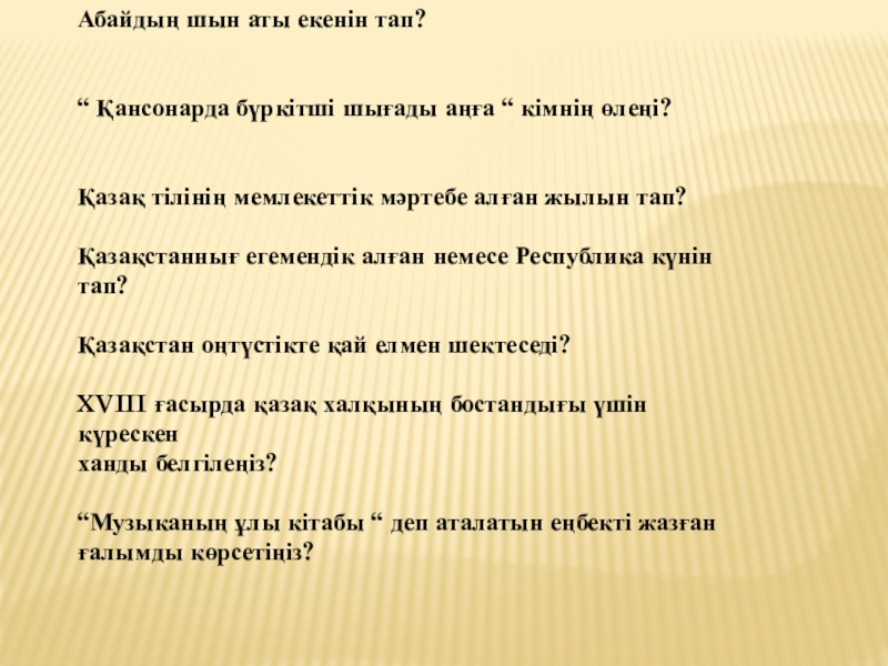 Абайдың шын аты екенін тап?“ Қансонарда бүркітші шығады аңға “ кімнің өлеңі?Қазақ тілінің мемлекеттік мәртебе алған жылын
