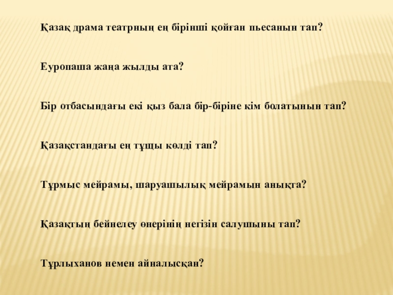Қазақ драма театрның ең бірінші қойған пьесанын тап?Еуропаша жаңа жылды ата?Бір отбасындағы екі қыз бала бір-біріне кім
