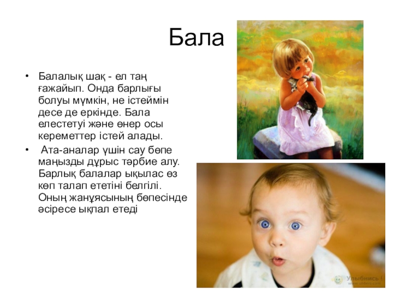 БалаБалалық шақ - ел таң ғажайып. Онда барлығы болуы мүмкiн, не iстеймiн десе де еркiнде. Бала елестетуi