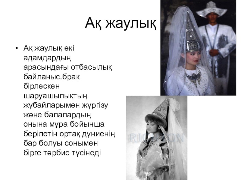 Ақ жаулықАқ жаулық екi адамдардың арасындағы отбасылық байланыс.брак бiрлескен шаруашылықтың жұбайларымен жүргiзу және балалардың онына мұра бойынша
