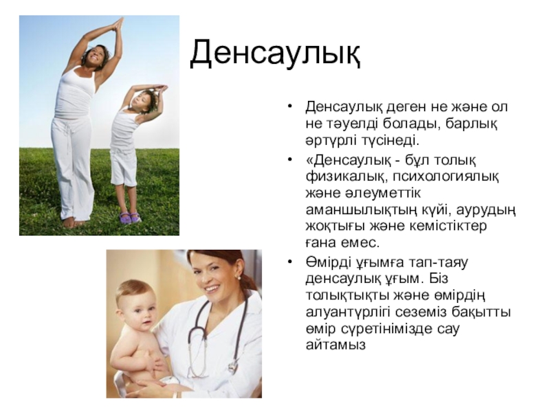 Денсаулық Денсаулық деген не және ол не тәуелдi болады, барлық әртүрлi түсiнедi.«Денсаулық - бұл толық физикалық, психологиялық