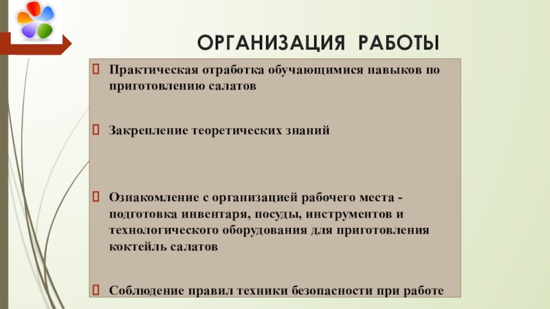 с организацией рабочего места - подготовка инвентаря, посуды, инструментов и технологического оборудования для приготовления коктейль салатов