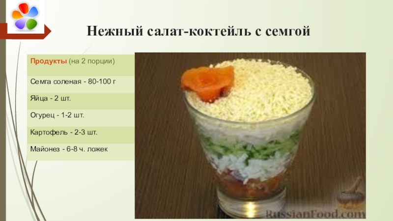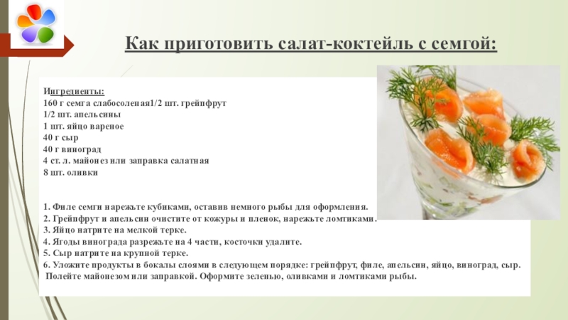 Слайд 19Как приготовить салат-коктейль с семгой: