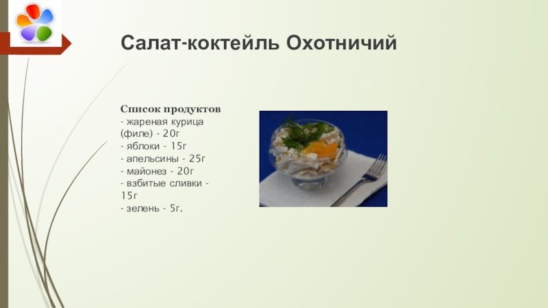 Слайд 34Салат-коктейль с ветчиной и грибами