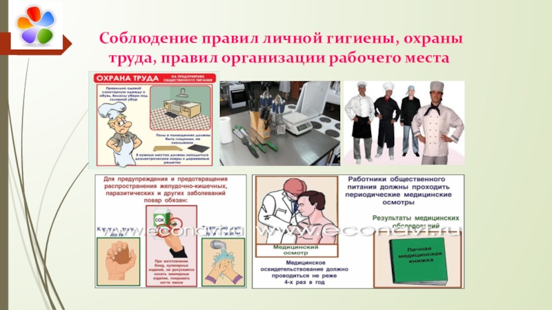 Слайд 6Соблюдение правил личной гигиены, охраны труда, правил организации рабочего места