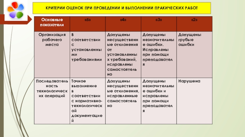 Слайд 42КРИТЕРИИ ОЦЕНОК ПРИ ПРОВЕДЕНИИ И ВЫПОЛНЕНИИ ПРАКИЧЕСКИХ РАБОТ