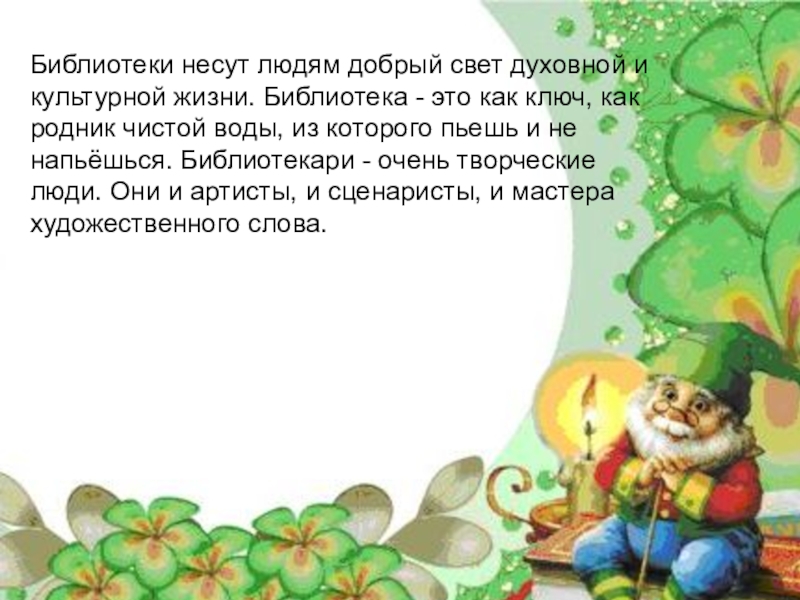 Слайд 7Библиотеки несут людям добрый свет духовной и культурной жизни. Библиотека -