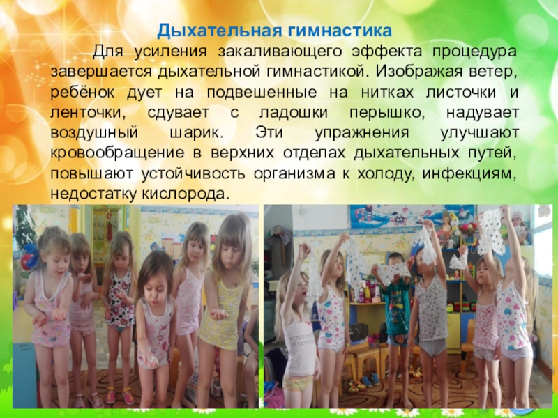 дыхательной гимнастикой. Изображая ветер, ребёнок дует на подвешенные на нитках листочки и ленточки, сдувает с ладошки перышко, надувает воздушный шарик. Эти упражнения улучшают кровообращение в верхних отделах дыхательных путей, повышают устойчивость организма к холоду, инфекциям, недостатку кислорода.