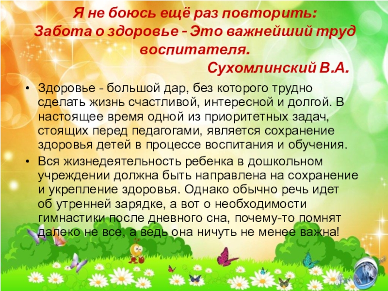 Здоровье - большой дар, без которого трудно сделать жизнь счастливой, интересной и долгой. В настоящее время одной из приоритетных задач, стоящих перед педагогами, является сохранение здоровья детей в процессе воспитания и обучения.
