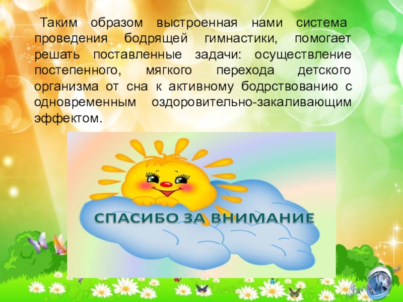 Таким образом выстроенная нами система проведения бодрящей гимнастики, помогает
