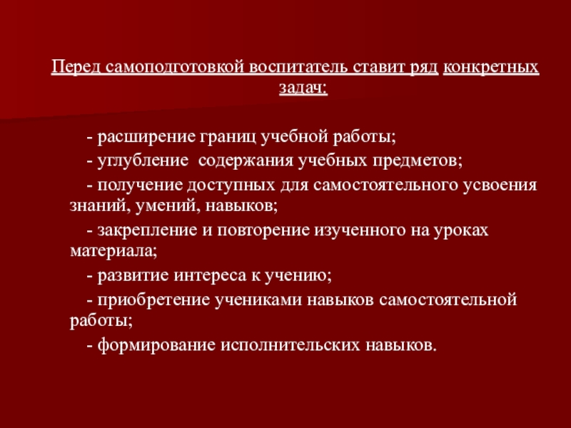 Перед самоподготовкой воспитатель ставит ряд конкретных задач:    - расширение границ учебной работы;