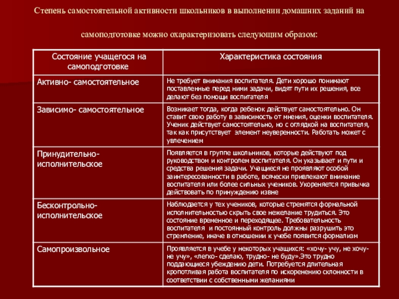 Степень самостоятельной активности школьников в выполнении домашних заданий на самоподготовке можно охарактеризовать следующим образом: