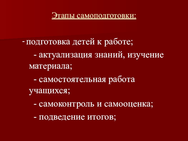 Этапы самоподготовки:- подготовка детей к работе;   - актуализация знаний, изучение материала;   - самостоятельная