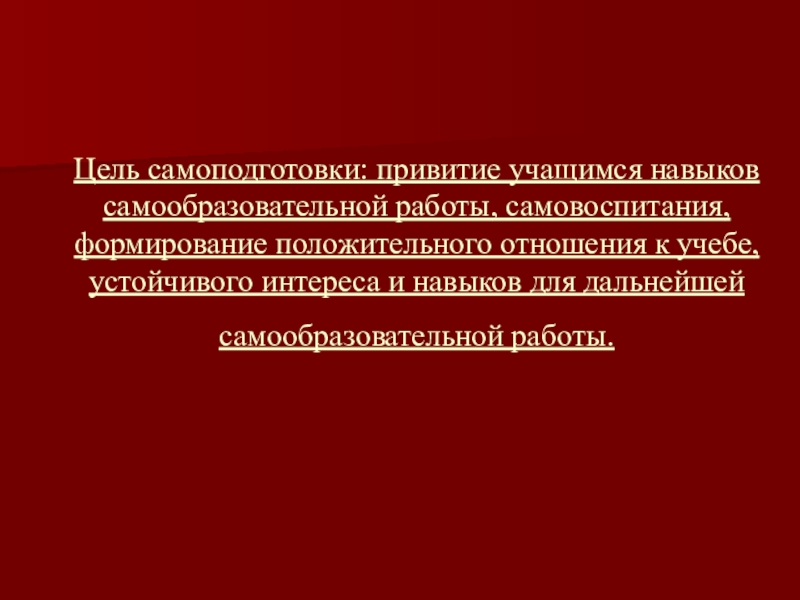 Слайд 2Цель самоподготовки: привитие учащимся навыков самообразовательной работы, самовоспитания, формирование положительного отношения