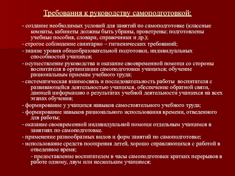 Требования к руководству самоподготовкой:- создание необходимых условий для занятий по самоподготовке (классные комнаты, кабинеты должны быть убраны,