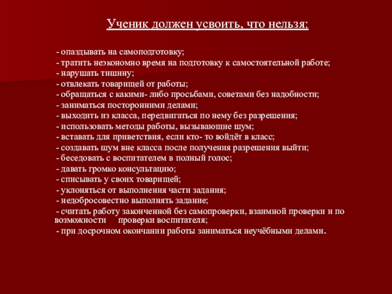 Ученик должен усвоить, что нельзя:    - опаздывать на самоподготовку;    - тратить