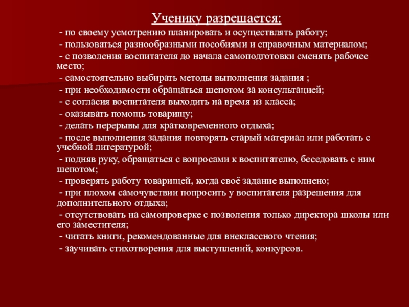 Ученику разрешается:    - по своему усмотрению планировать и осуществлять работу;    -