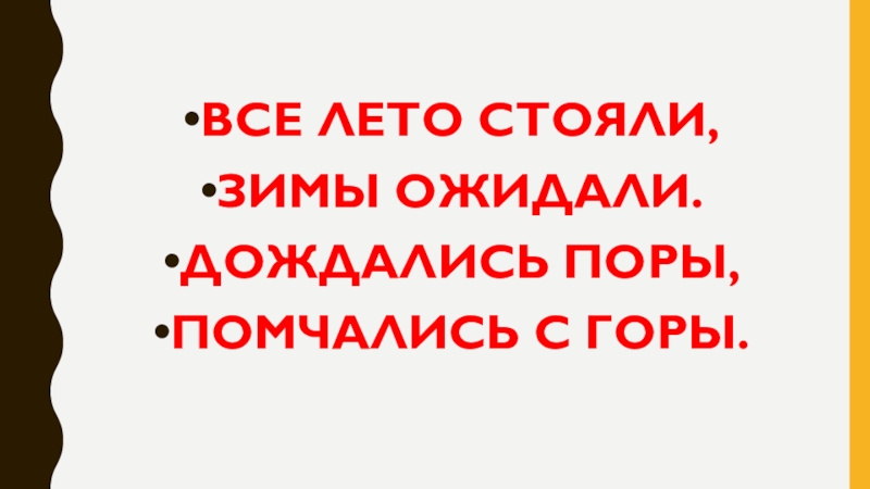 ВСЕ ЛЕТО СТОЯЛИ,ЗИМЫ ОЖИДАЛИ.ДОЖДАЛИСЬ ПОРЫ,ПОМЧАЛИСЬ С ГОРЫ.
