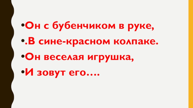 Он с бубенчиком в руке, .В сине-красном колпаке.Он веселая игрушка, И зовут его….