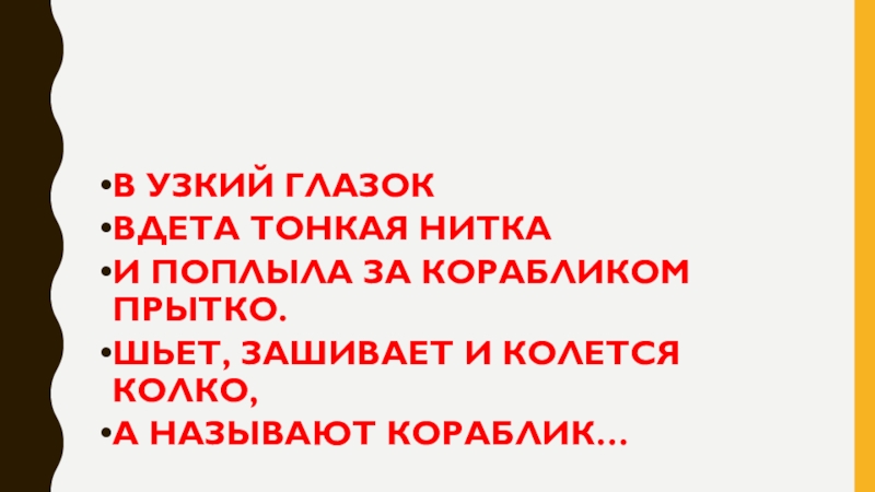 В УЗКИЙ ГЛАЗОКВДЕТА ТОНКАЯ НИТКАИ ПОПЛЫЛА ЗА КОРАБЛИКОМ ПРЫТКО.ШЬЕТ, ЗАШИВАЕТ И КОЛЕТСЯ КОЛКО, А НАЗЫВАЮТ КОРАБЛИК…