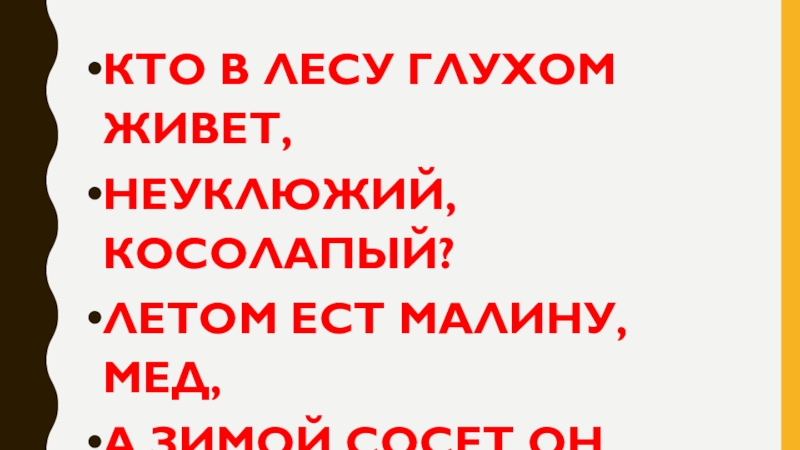 КТО В ЛЕСУ ГЛУХОМ ЖИВЕТ, НЕУКЛЮЖИЙ, КОСОЛАПЫЙ?ЛЕТОМ ЕСТ МАЛИНУ, МЕД,А ЗИМОЙ СОСЕТ ОН ЛАПУ.