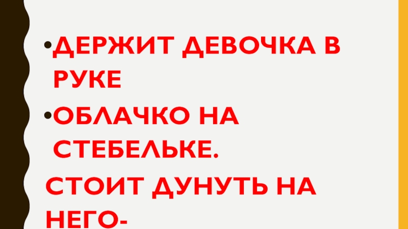 ДЕРЖИТ ДЕВОЧКА В РУКЕОБЛАЧКО НА СТЕБЕЛЬКЕ.СТОИТ ДУНУТЬ НА НЕГО-И НЕ БУДЕТ НИЧЕГО.