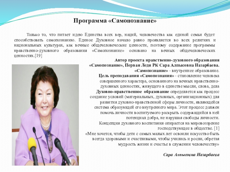 Автор проекта нравственно-духовного образования «Самопознание», Первая Леди РК Сара Алпысовна Назарбаева.
