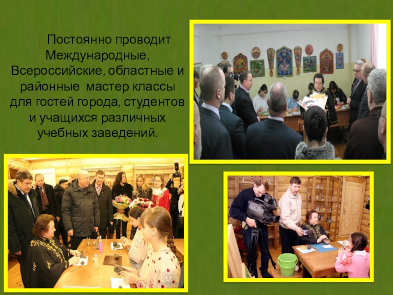Слайд 31Постоянно проводит Международные, Всероссийские, областные и районные мастер классы для гостей