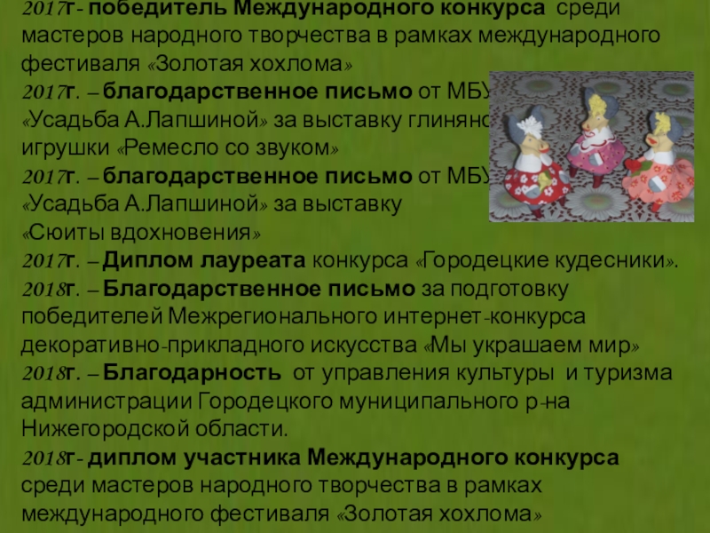 2017г- победитель Международного конкурса среди мастеров народного творчества в рамках международного фестиваля «Золотая хохлома»2017г. – благодарственное письмо