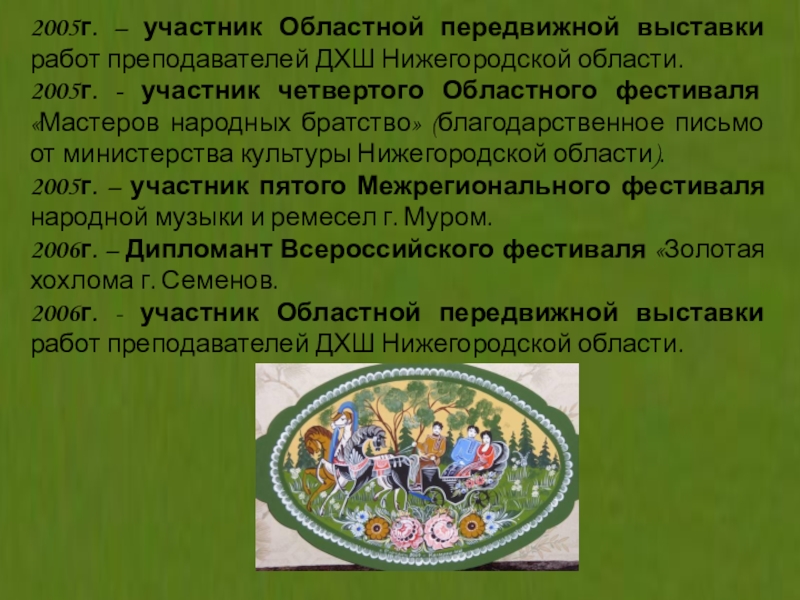 2006г. – Дипломант Всероссийского фестиваля «Золотая хохлома г. Семенов.