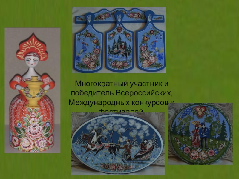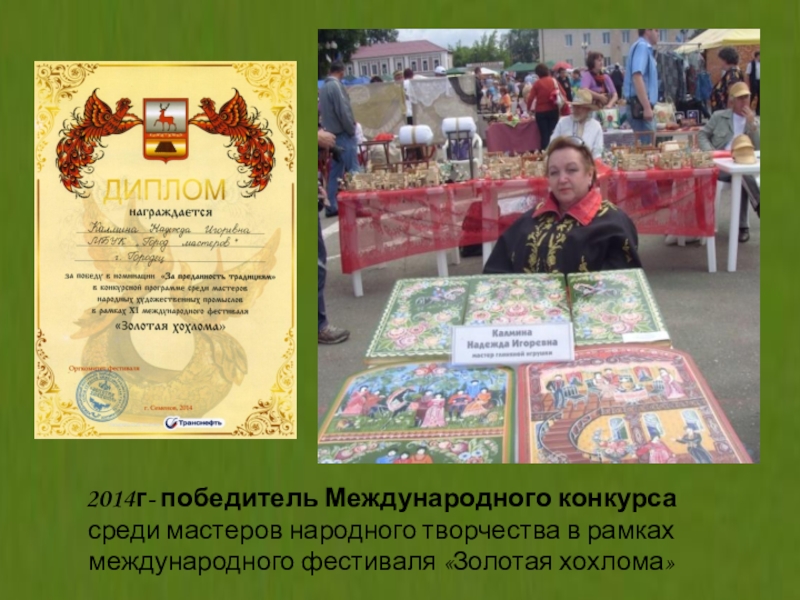 2014г- победитель Международного конкурса среди мастеров народного творчества в рамках международного фестиваля «Золотая хохлома»