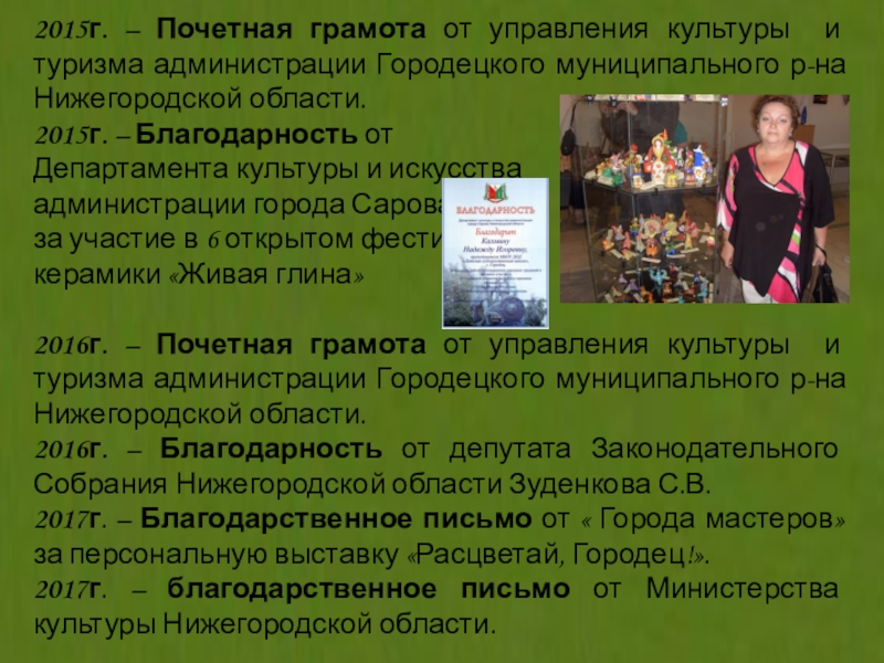 2017г. – Благодарственное письмо от « Города мастеров» за персональную выставку «Расцветай, Городец!».
