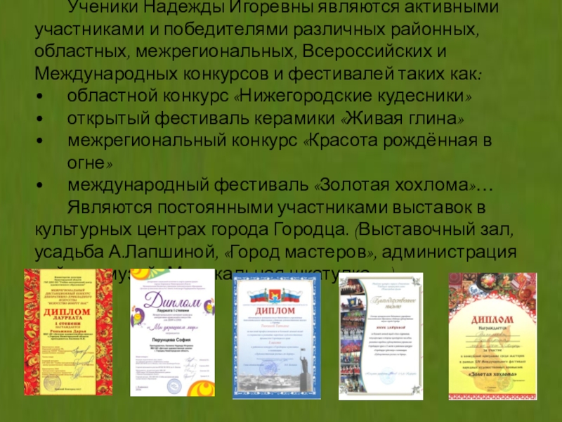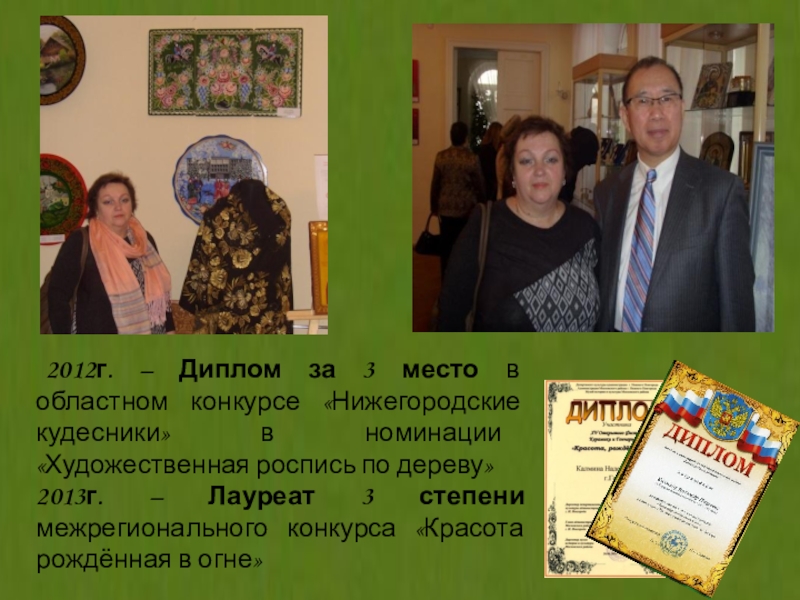 2012г. – Диплом за 3 место в областном конкурсе «Нижегородские кудесники» в номинации «Художественная роспись по