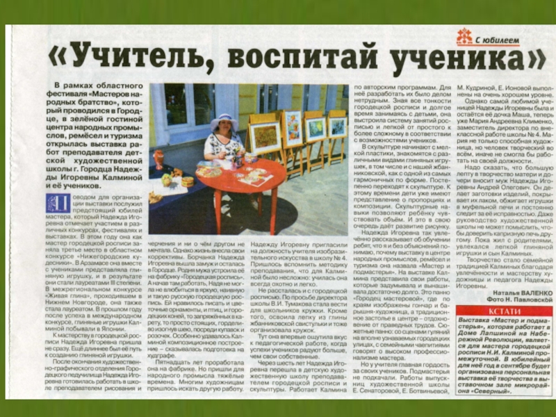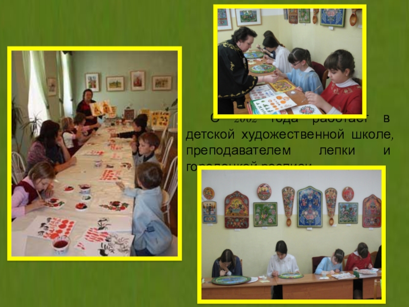 Слайд 33С 2002 года работает в детской художественной школе, преподавателем лепки и