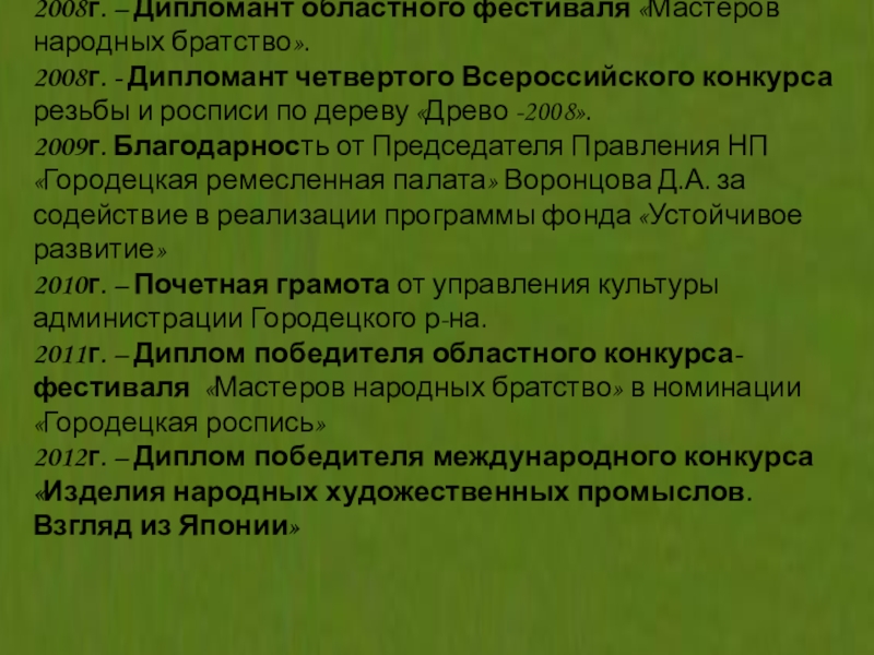 2008г. – Дипломант областного фестиваля «Мастеров народных братство».2008г. - Дипломант четвертого Всероссийского конкурса резьбы и росписи по