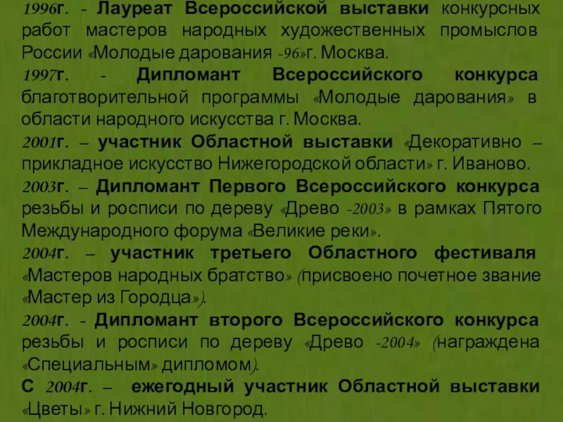 Слайд 31996г. - Лауреат Всероссийской выставки конкурсных работ мастеров народных художественных промыслов