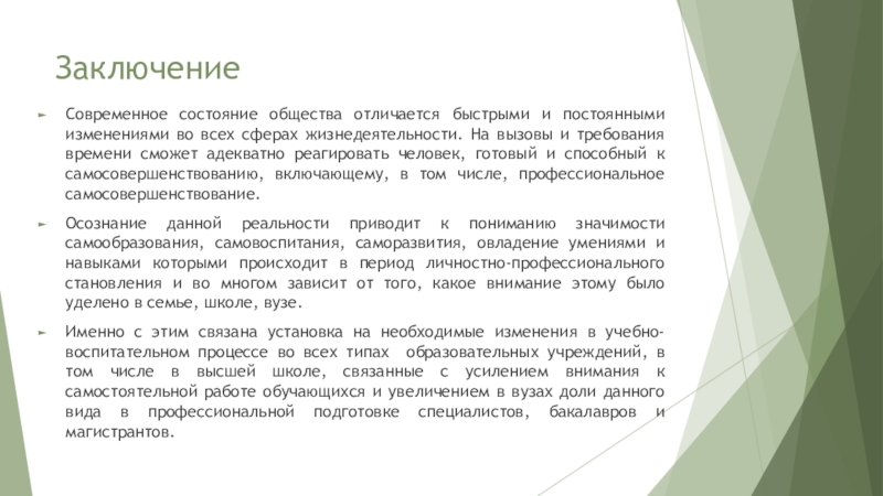 Осознание данной реальности приводит к пониманию значимости самообразования, самовоспитания, саморазвития, овладение умениями и навыками которыми происходит в период личностно-профессионального становления и во многом зависит от того, какое внимание этому было уделено в семье, школе, вузе.