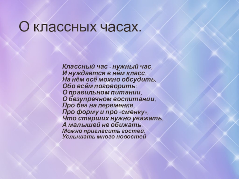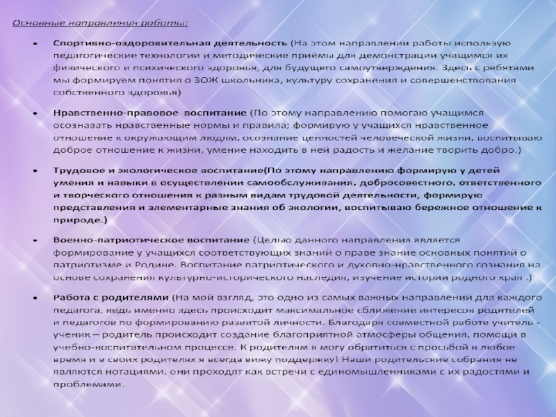 руководителя - целенаправленная, системная, планируемая деятельность. Свою деятельность классного руководителя я строю на основе программы воспитания образовательного учреждения, позитивных и негативных тенденций общественной жизни, на основе личностно - ориентированного подхода с учетом актуальных задач, стоящих перед педагогическим коллективом школы, и ситуации в классном коллективе. При планировании воспитательной деятельности обязательно принимаю во внимание уровень воспитанности обучающихся, социальные и материальные условия их жизни, специфику семейных обстоятельств. Я считаю, что воспитание только тогда эффективно, когда происходит совокупность применения методов: убеждения, примера, соревнования, поощрения.