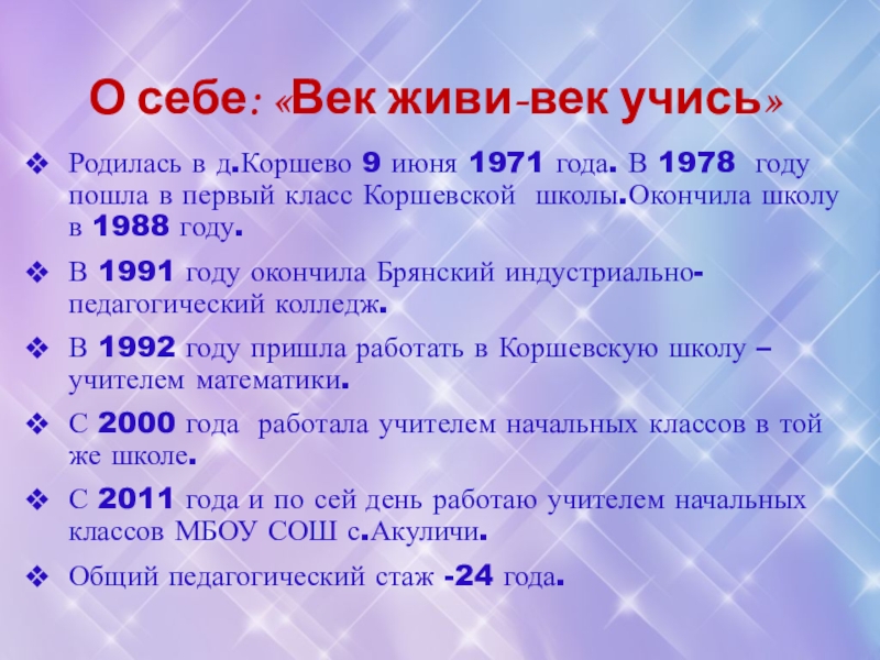 В 1978 году пошла в первый класс Коршевской школы.Окончила школу в 1988 году.
