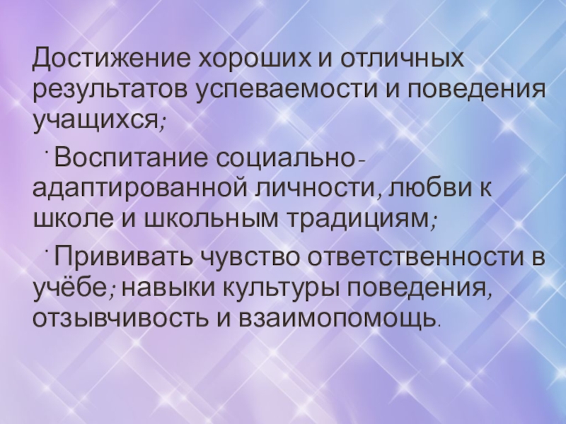 Слайд 8Достижение хороших и отличных результатов успеваемости и поведения учащихся;