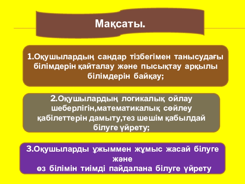 1.Оқушылардың сандар тізбегімен танысудағы білімдерін қайталау және пысықтау арқылы білімдерін байқау;
