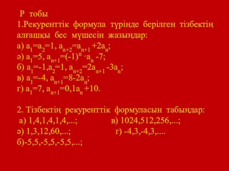 1.Рекуренттік формула түрінде берілген тізбектің алғашқы бес мүшесін жазыңдар: