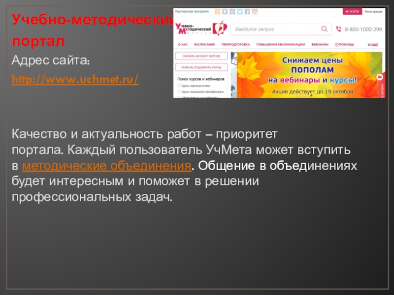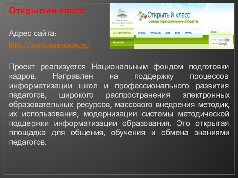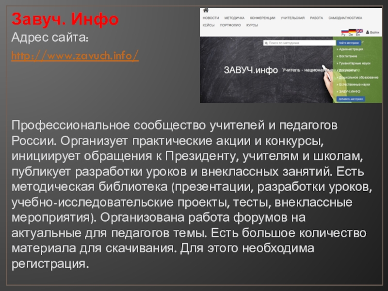 и конкурсы, инициирует обращения к Президенту, учителям и школам, публикует разработки уроков и внеклассных занятий. Есть методическая библиотека (презентации, разработки уроков, учебно-исследовательские проекты, тесты, внеклассные мероприятия). Организована работа форумов на актуальные для педагогов темы. Есть большое количество материала для скачивания. Для этого необходима регистрация.