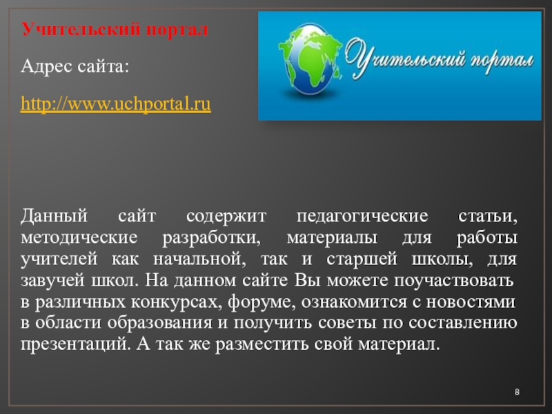 для работы учителей как начальной, так и старшей школы, для завучей школ. На данном сайте Вы можете поучаствовать в различных конкурсах, форуме, ознакомится с новостями в области образования и получить советы по составлению презентаций. А так же разместить свой материал.