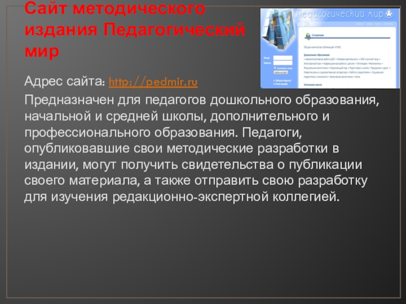 Педагогический мир Адрес сайта: http://pedmir.ru/