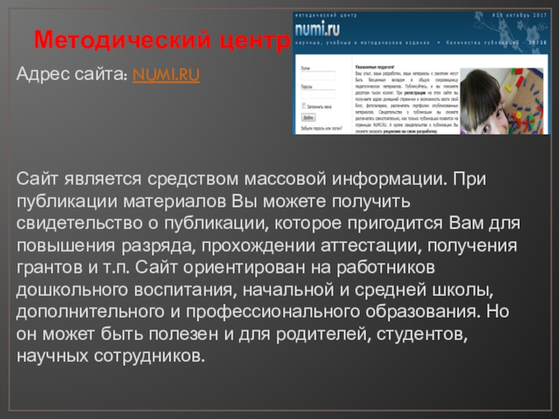 можете получить свидетельство о публикации, которое пригодится Вам для повышения разряда, прохождении аттестации, получения грантов и т.п. Сайт ориентирован на работников дошкольного воспитания, начальной и средней школы, дополнительного и профессионального образования. Но он может быть полезен и для родителей, студентов, научных сотрудников.