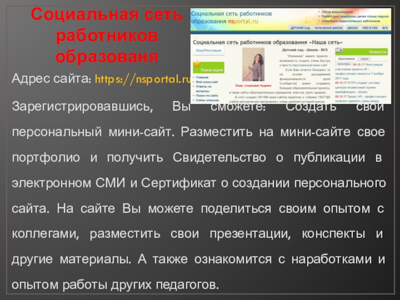 персональный мини-сайт. Разместить на мини-сайте свое портфолио и получить Свидетельство о публикации в электронном СМИ и Сертификат о создании персонального сайта. На сайте Вы можете поделиться своим опытом с коллегами, разместить свои презентации, конспекты и другие материалы. А также ознакомится с наработками и опытом работы других педагогов.