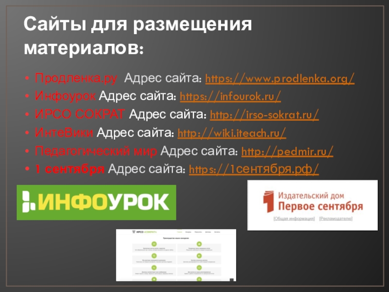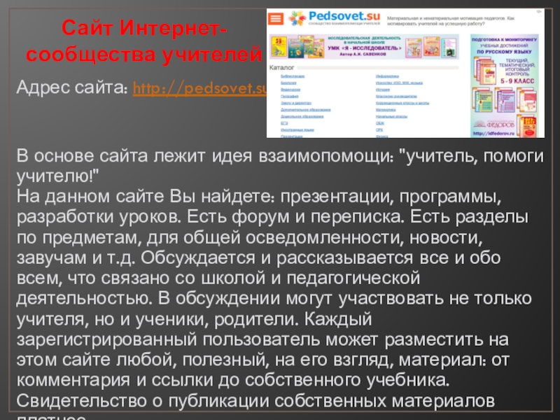 На данном сайте Вы найдете: презентации, программы, разработки уроков. Есть форум и переписка. Есть разделы по предметам, для общей осведомленности, новости, завучам и т.д. Обсуждается и рассказывается все и обо всем, что связано со школой и педагогической деятельностью. В обсуждении могут участвовать не только учителя, но и ученики, родители. Каждый зарегистрированный пользователь может разместить на этом сайте любой, полезный, на его взгляд, материал: от комментария и ссылки до собственного учебника. Свидетельство о публикации собственных материалов платное.