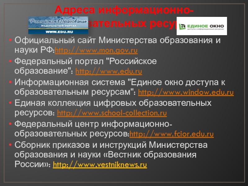 Федеральный центр информационно-образовательных ресурсов:http://www.fcior.edu.ru